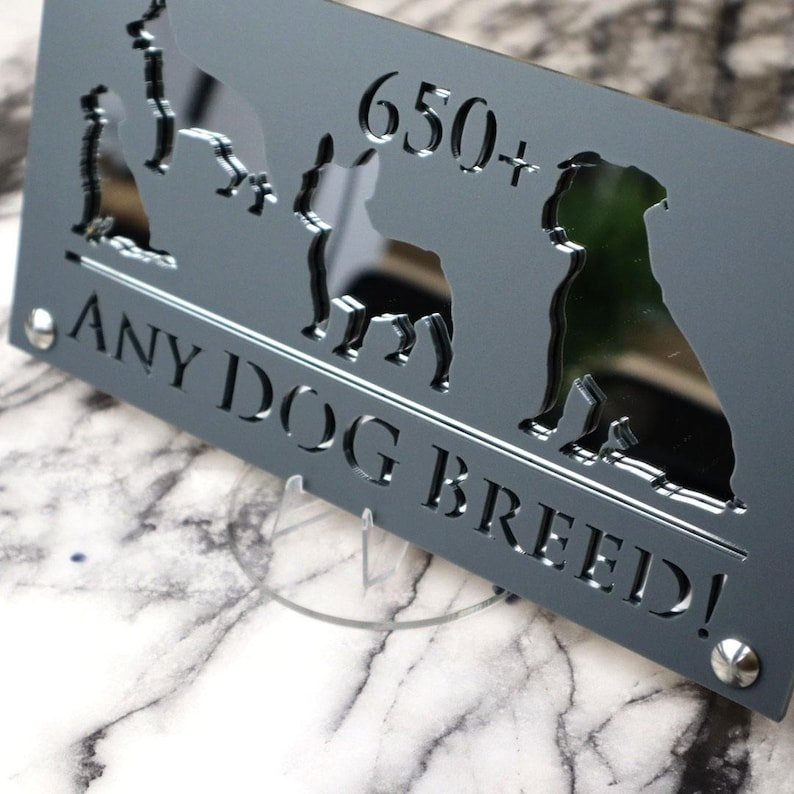 Crafted with premium materials including a Matt Gray (Anthracite) Perspex front, your choice of mirrored or marble effect backplate, and four stainless steel fittings, this 280mm x 140mm sign is a unique blend of pet love and luxury signage. It arrives complete with a fitting kit and wall template for easy installation.
