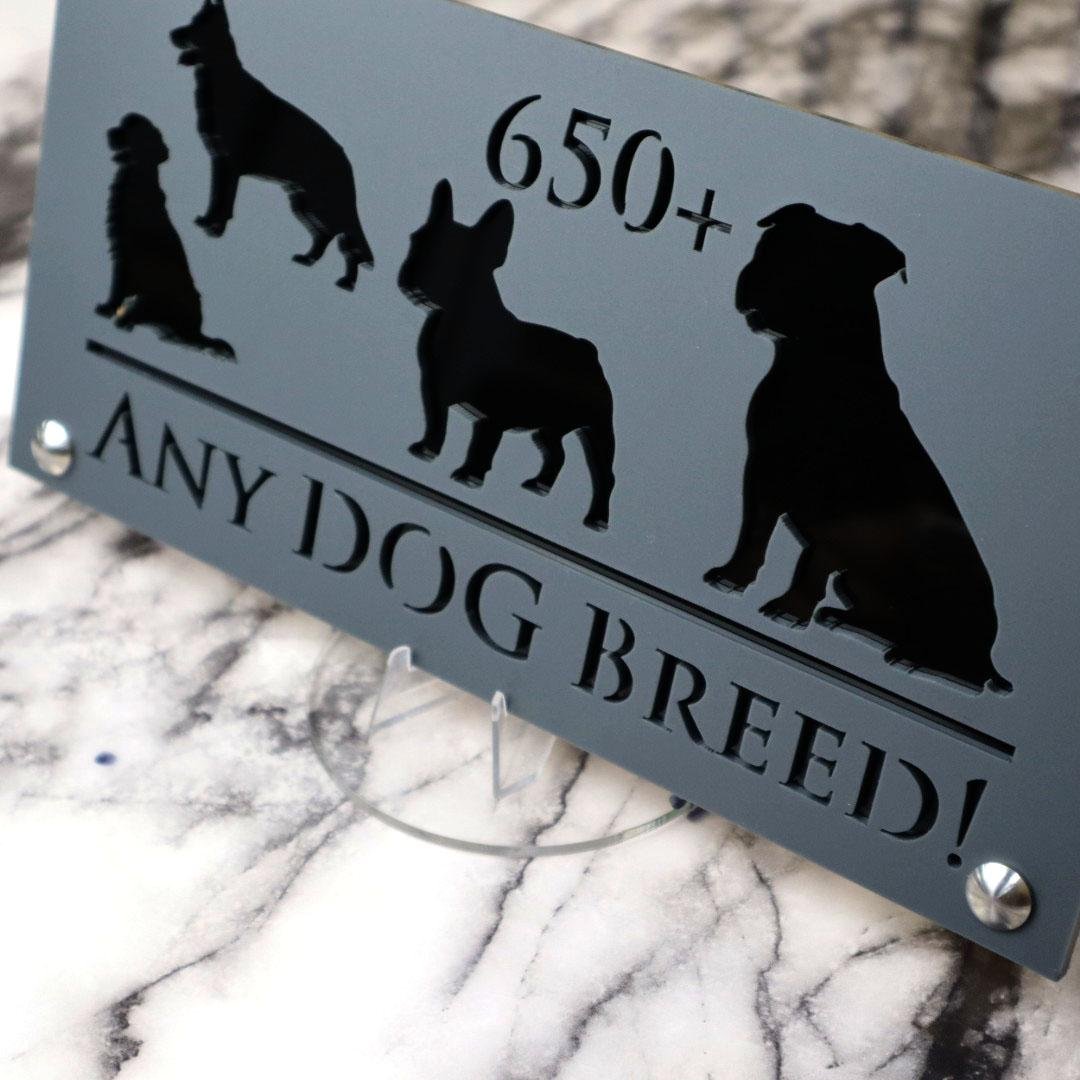 Introducing Dog Luxe A4: Elevate Your Home with Elegance YOU CAN HAVE ANY DOG BREED YOU WANT ON THIS SIGN – We have an extensive database with over 650 dog breeds. Just let us know your preferred breed, your house number, and your street name.